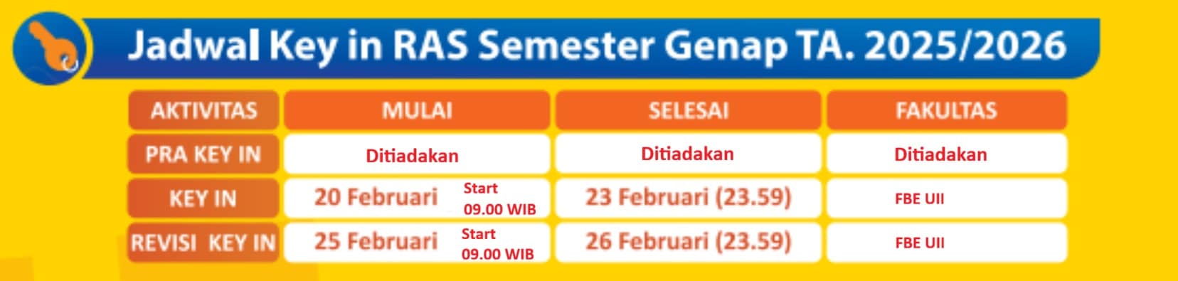 Diberitahukan kepada mahasiswa S1 Fakultas Bisnis dan Ekonomika UII (Semester 3 ke atas, Angkatan 2024 ke atas) bahwa jadwal KEY IN untuk Semester Genap 2025/2026 adalah sebagai berikut: